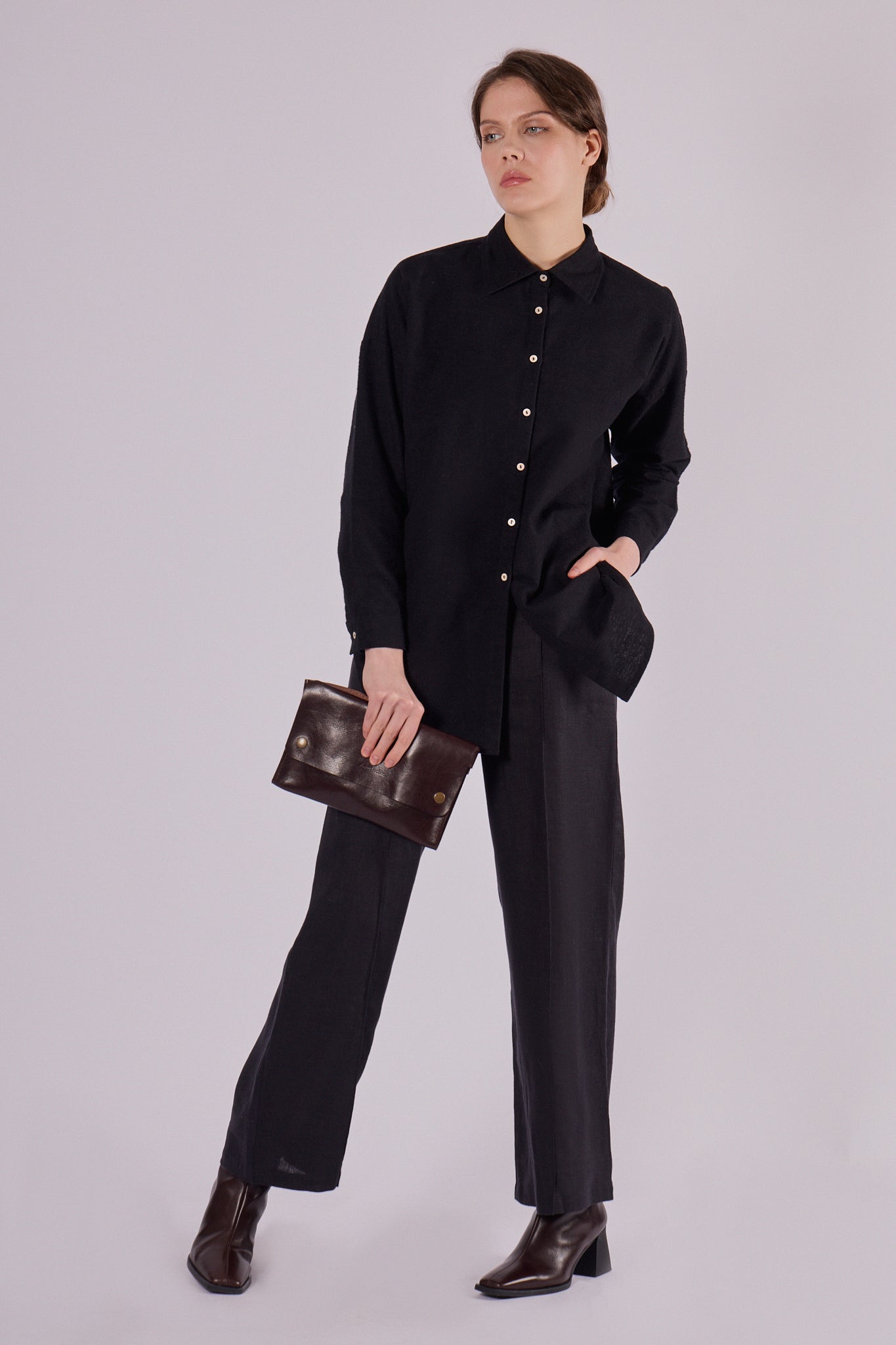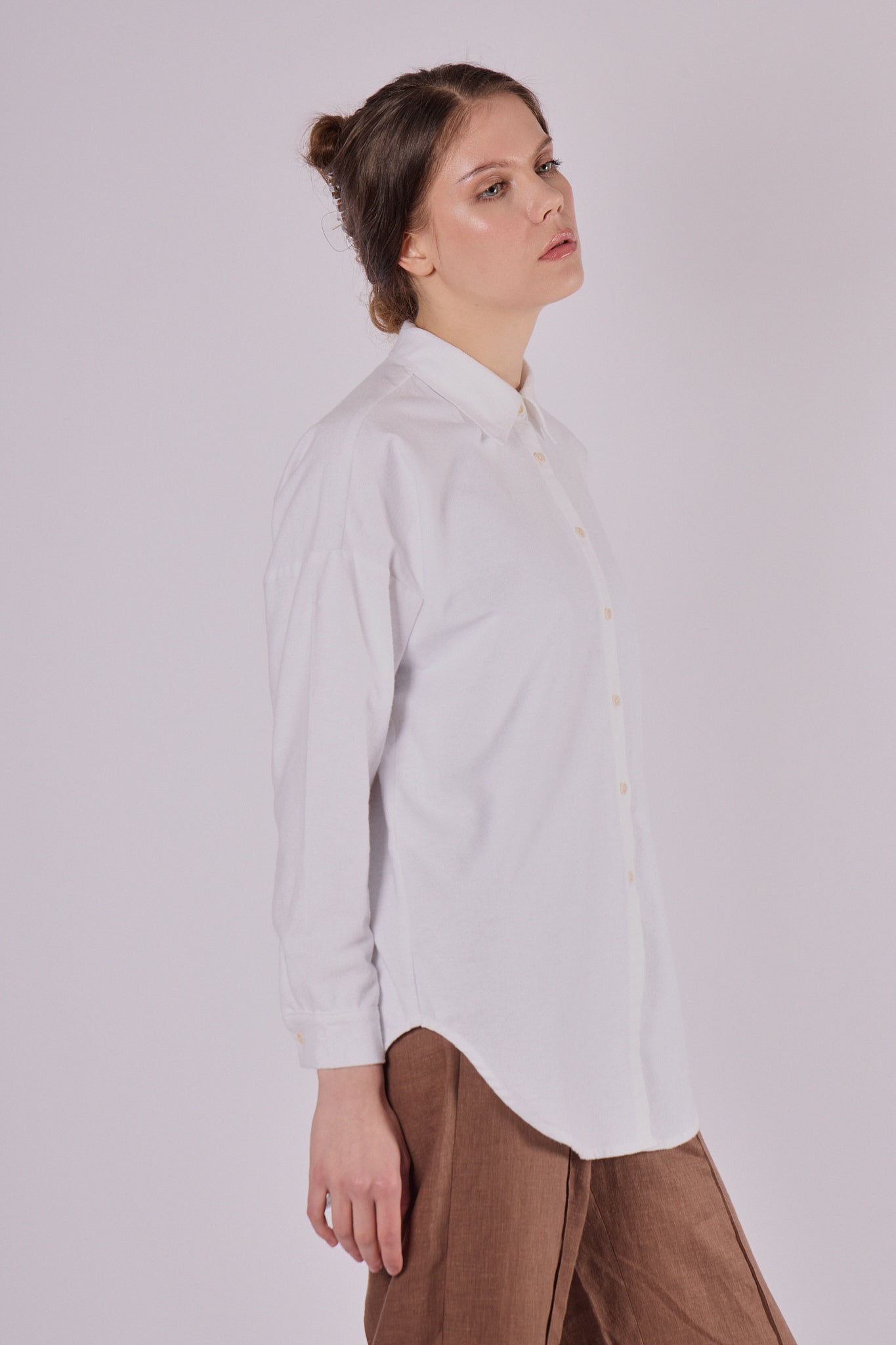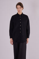Stylová dámská košile s klasickým límečkem, vyrobená z mimořádně jemného flanelu. Loose fit střih zajišťuje pohodlí a volnost pohybu, zároveň ale zachovává elegantní vzhled. Ideální kousek pro celý rok – v létě jako lehká vrstva, v zimě jako pohodlný základ outfitu.