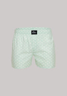 Men's shorts Green with polka dots made of high-quality 100% cotton with soft rubber. Ideal for sleeping, leisure time and daily wear as underwear. Sophisticated cut that combines convenience and comfort for all types of pants and figures. Concealed flap with button made of natural material Corrozo, practical three-piece part in the seating area. Precisely made in the EU.