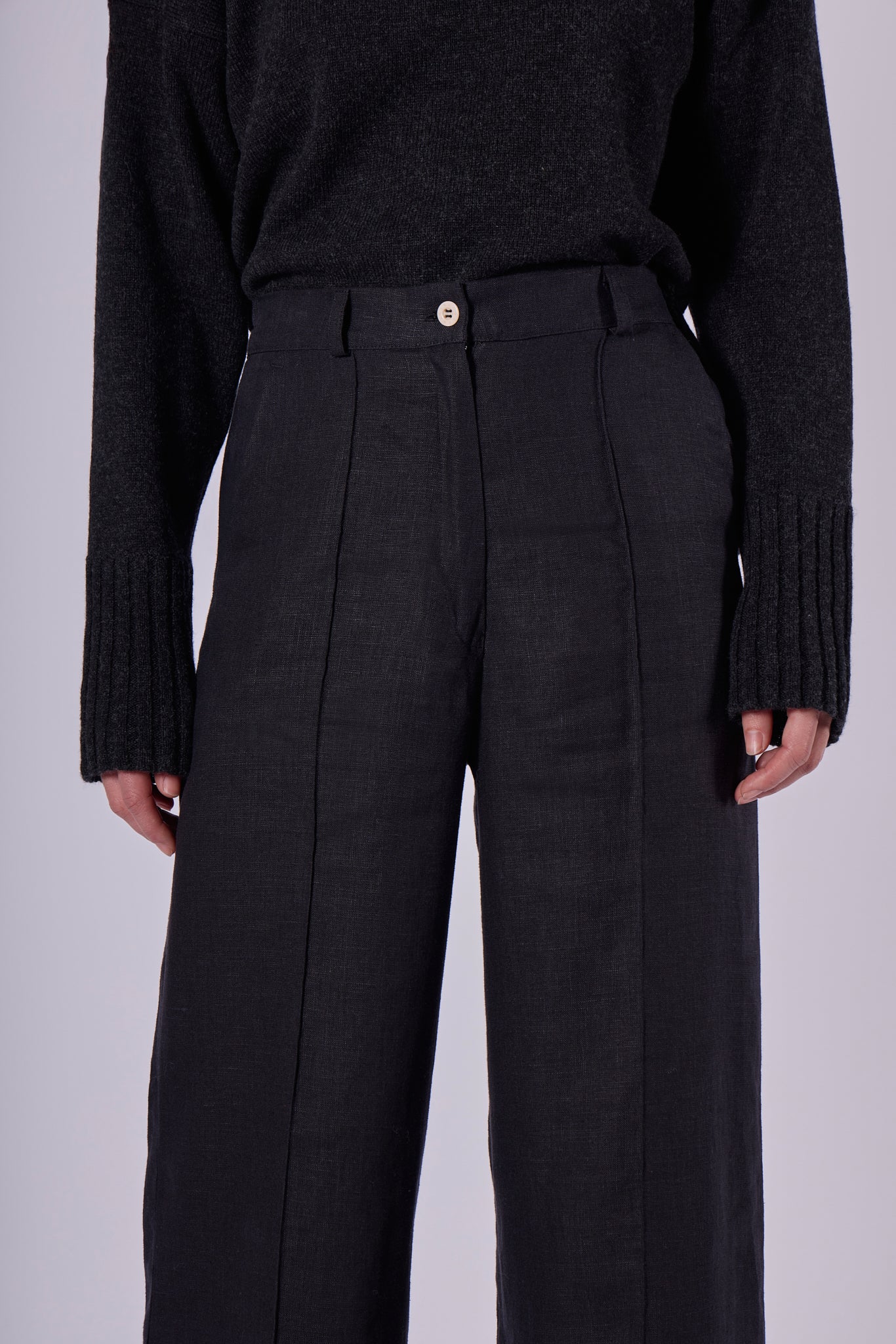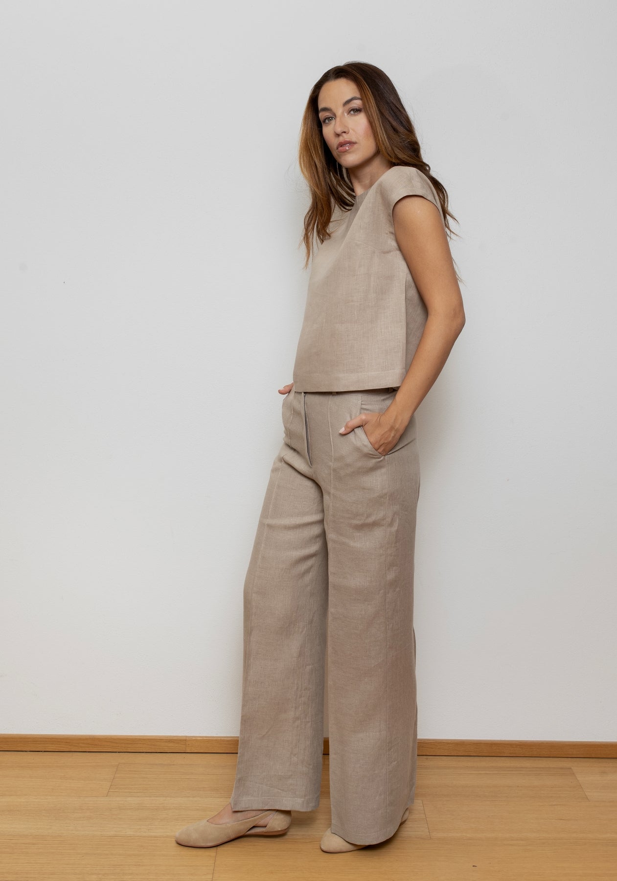 Dzięki neutralnemu kolorowi spodnie idealnie łączą się ze wszystkimi wariantami kolorystycznymi lnianych topów z naszej kolekcji.