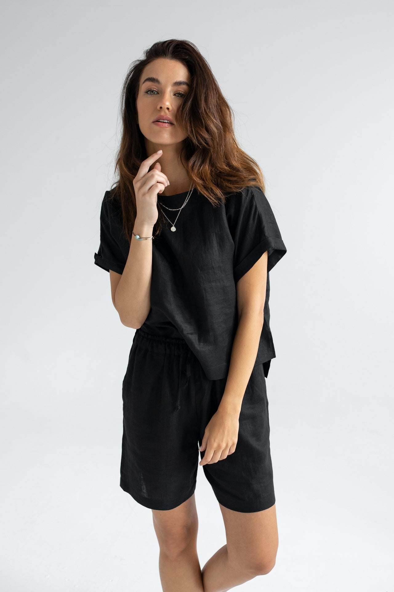 Lniany top damski z dłuższym tyłem. Niesamowicie przyjemne dla ciała dzięki zmiękczającemu wykończeniu materiału. Rozmiar jest dość duży - luźny krój. Wyprodukowano precyzyjnie i w sposób zrównoważony w UE.