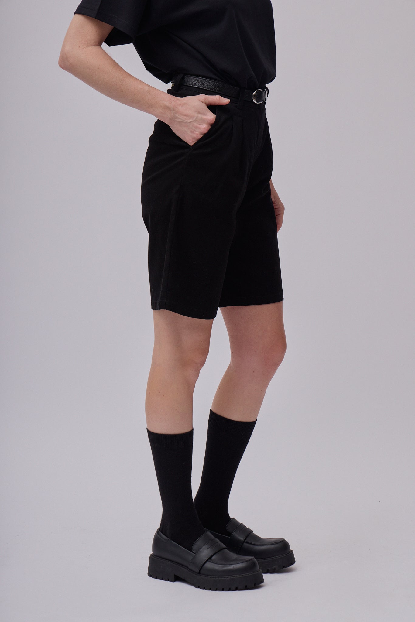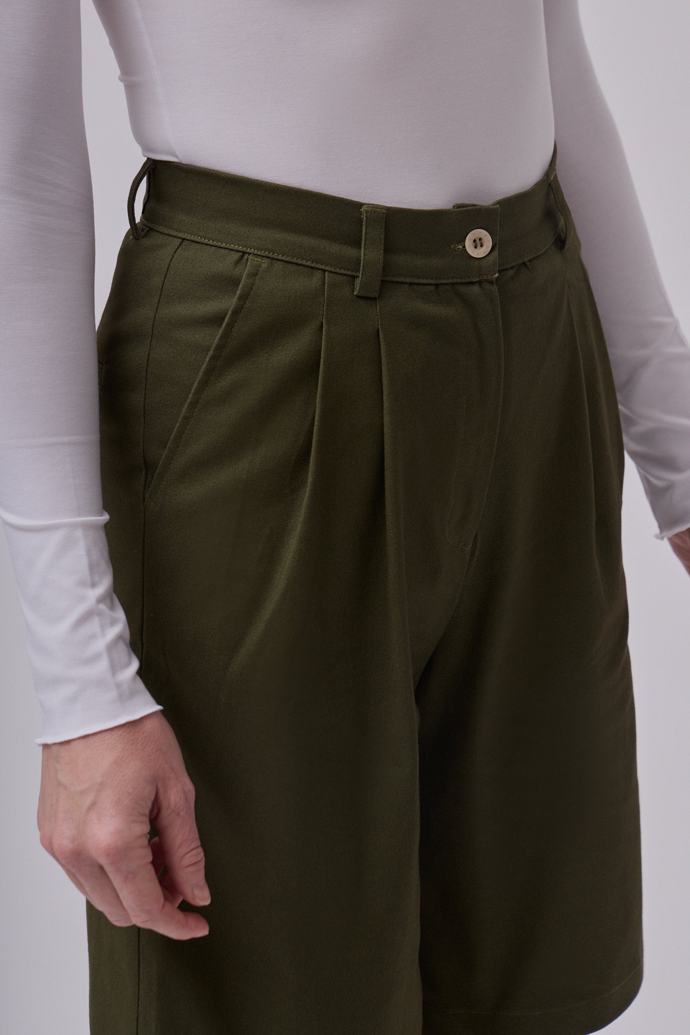 Damskie bawełniane szerokie szorty to ponadczasowy element garderoby, którego nie powinno zabraknąć w kapsułowej szafie. Dzięki prostemu, eleganckiemu krojowi prezentują się schludnie i profesjonalnie, dlatego świetnie sprawdzą się w biurze, na spotkaniach biznesowych oraz podczas bardziej formalnych okazji. Jednocześnie można je łatwo łączyć z bardziej casualowymi elementami garderoby, tworząc wygodne stylizacje na co dzień. Stabilny pas ze szlufkami na pasek zapewnia wygodne dopasowanie w talii i elegancką sylwetkę.