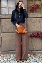 Outfit by Iva Fruhlingová | Brown linen pants & Deep blue shirt