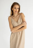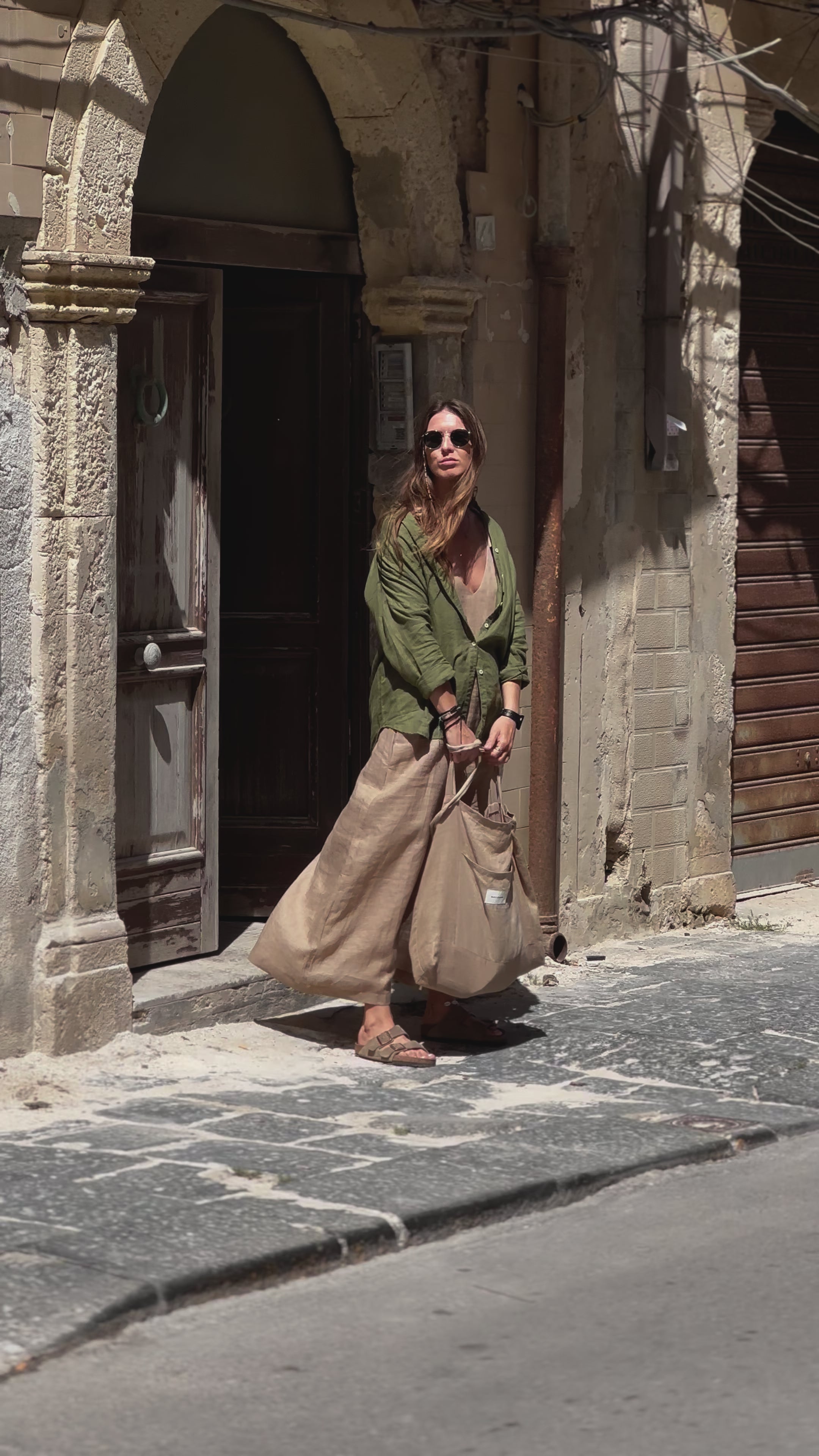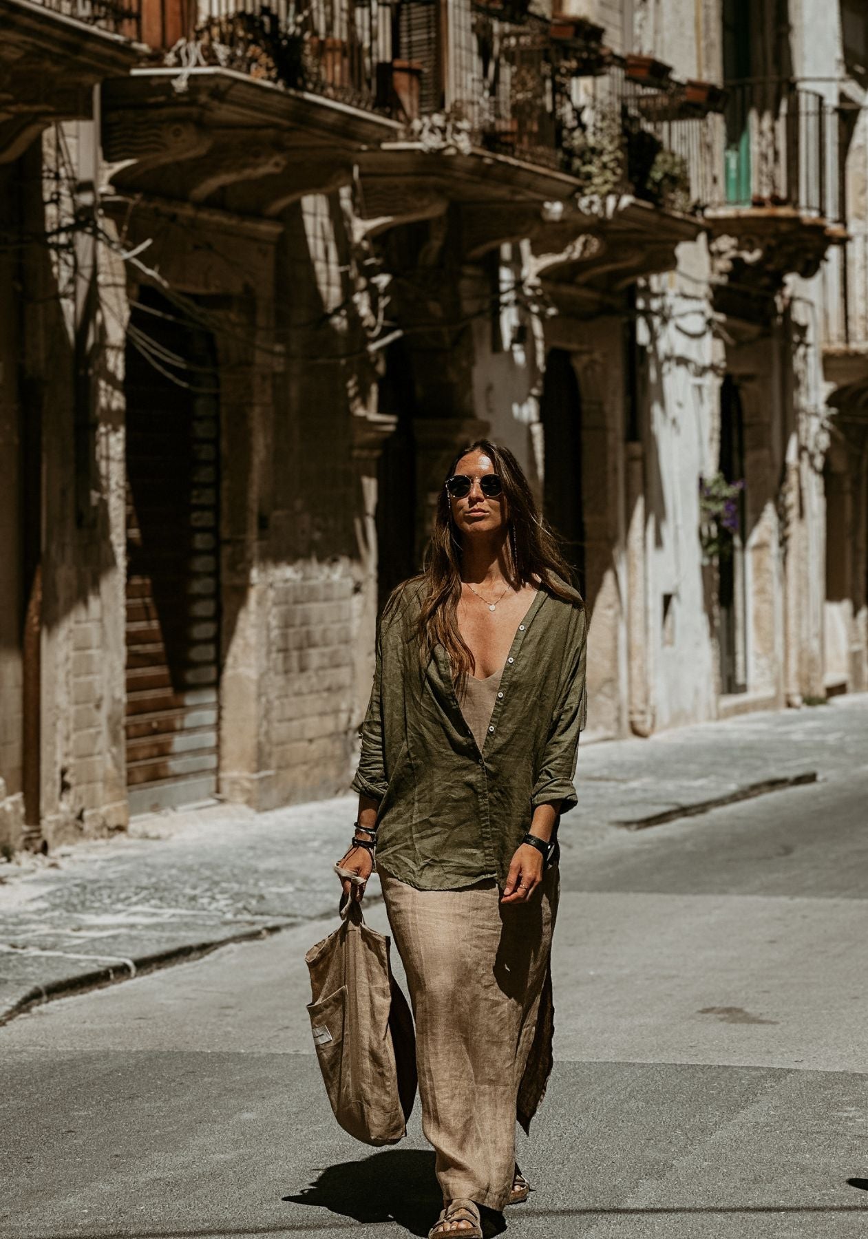 Wybrana stylizacja oddaje lekkość w 100% naturalnego materiału i jego doskonałe ułożenie warstw w postaci długiej lnianej sukienki i luźnej lnianej koszuli. Wielki Post i lato idą w parze, a Ty będziesz mógł komfortowo cieszyć się każdą chwilą.