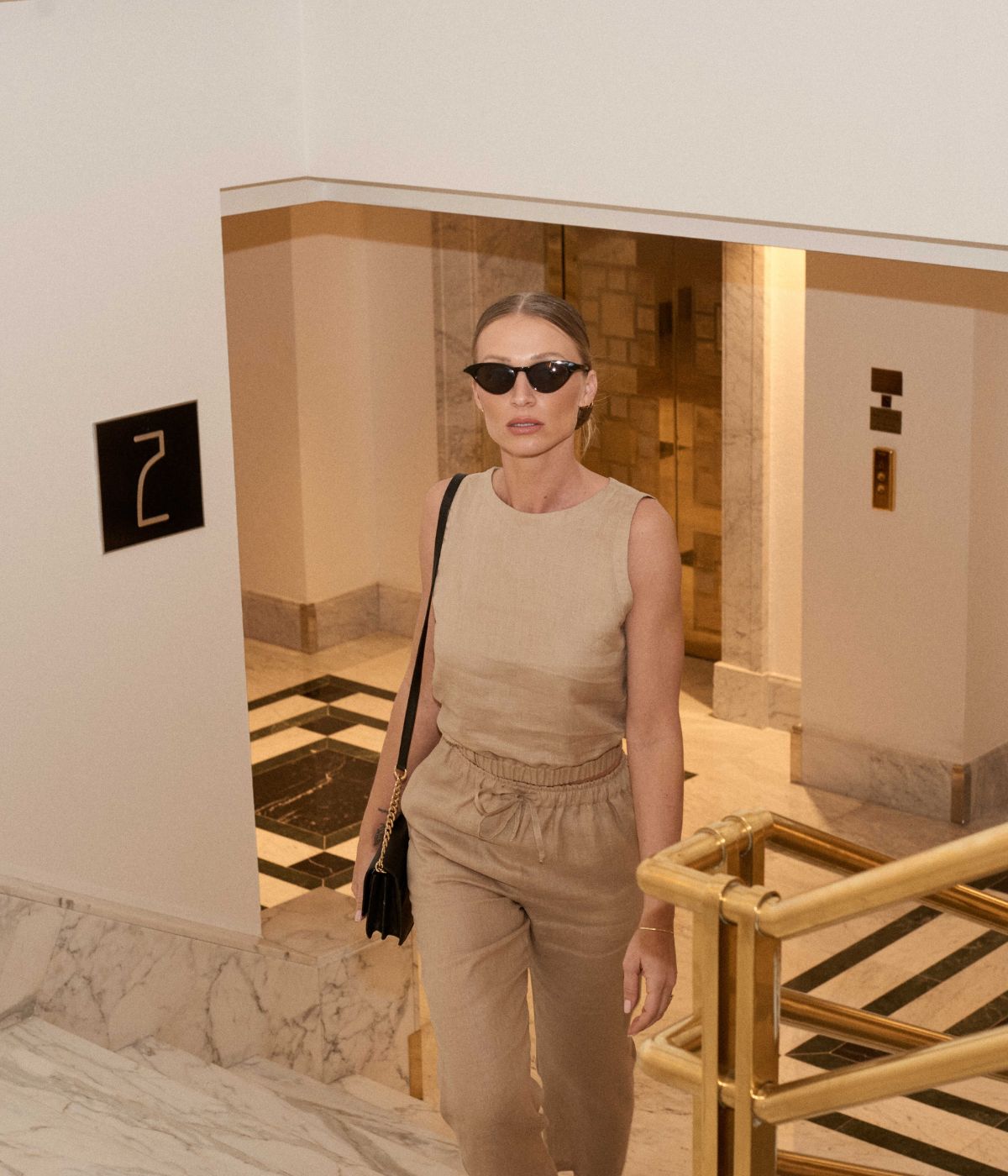 Dowód na to, że nawet prosty monochromatyczny look może być niezwykle szykowny i elegancki. Lniana odzież świetnie nadaje się do mieszania i nakładania warstw. Ten strój składa się z lnianego krótkiego topu i luźnych lnianych spodni 7/8.