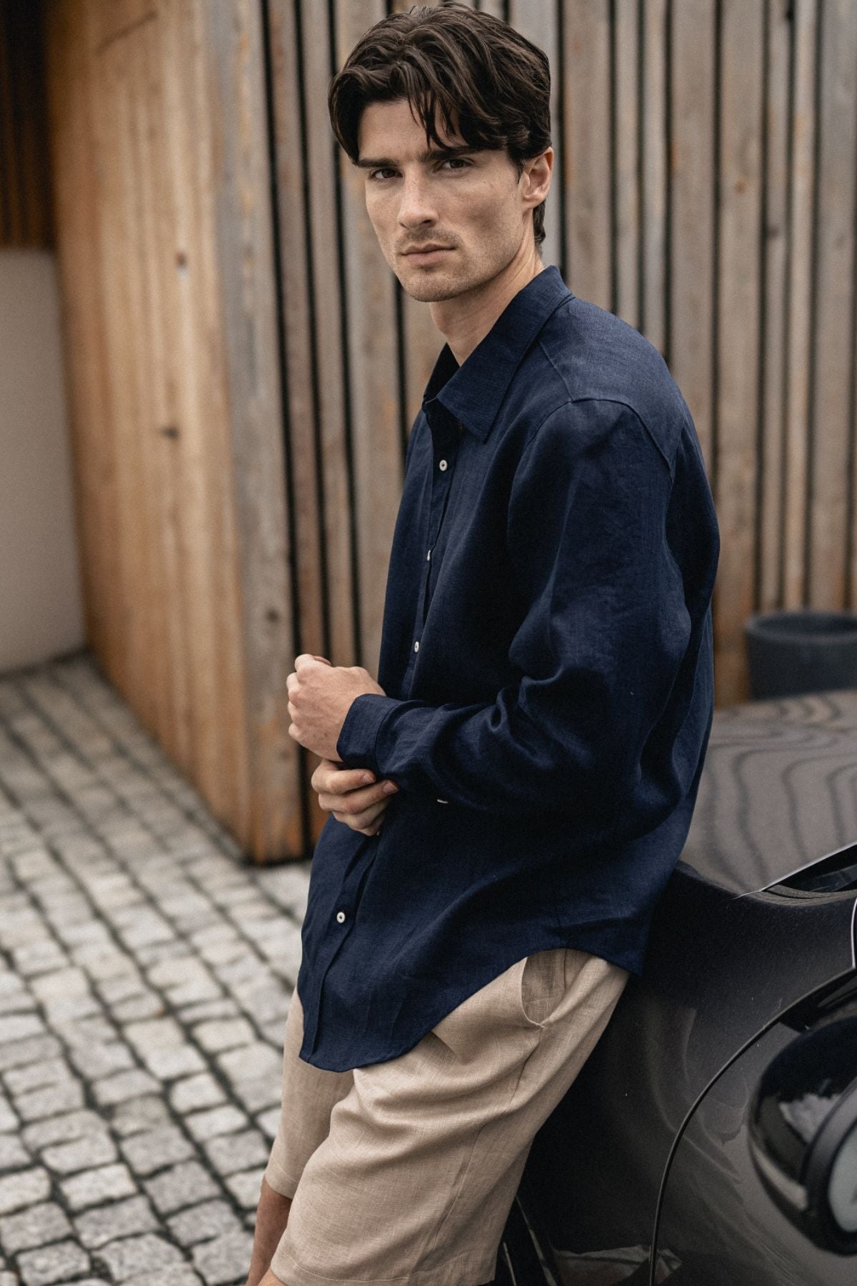 Outfit by Patrik | Linen shorts & shirt with collar Deep blue