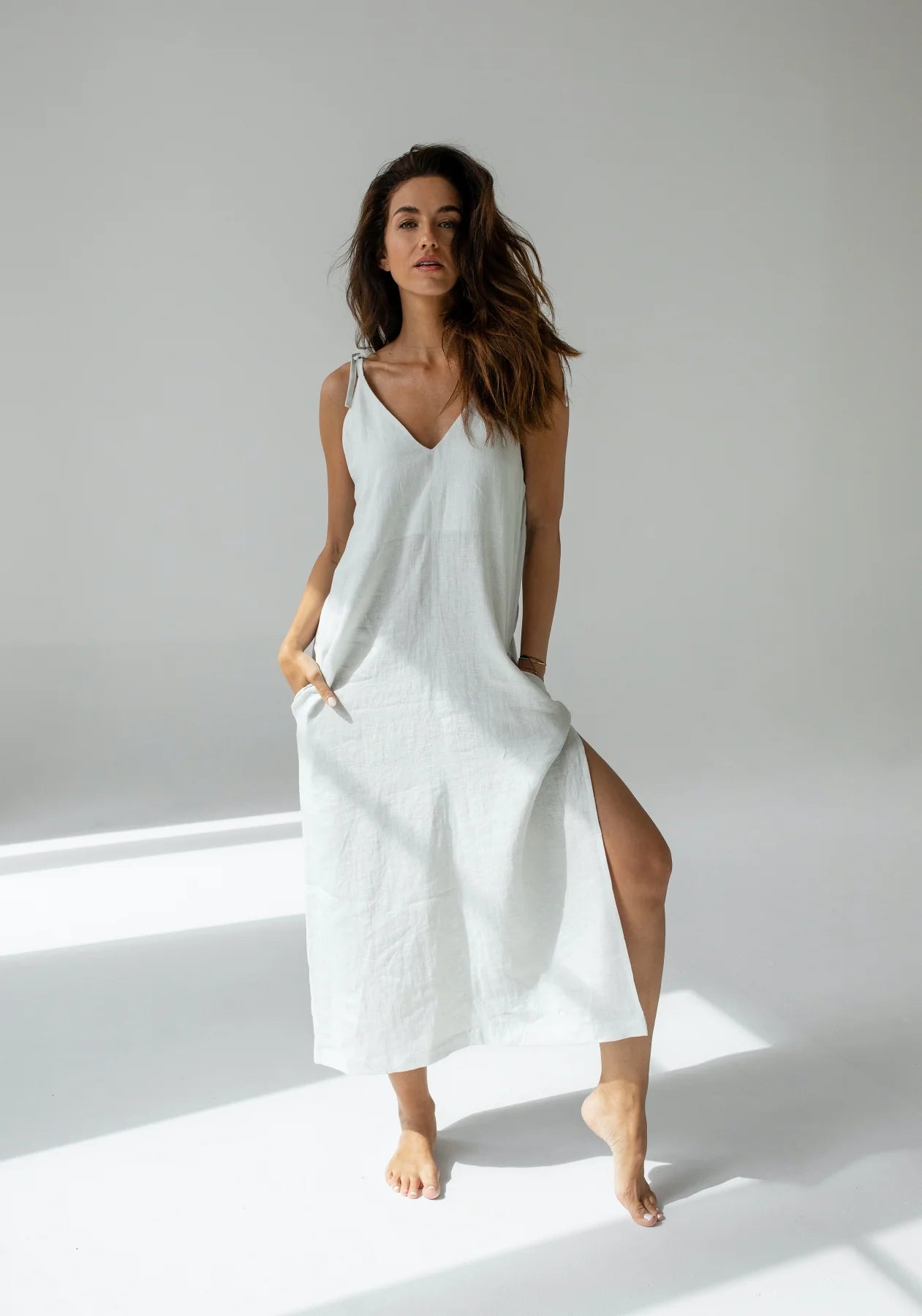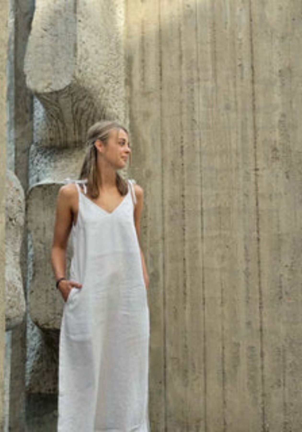 Dlhé ľanové šaty sú hravé a ich ramienka môžete uviazať na ramenách alebo pokojne na chrbte a tým pádom padnú všetkým veľkostiam. Dámske ľanové šaty sú ušité precízne z prírodného materiálu v ČR.
