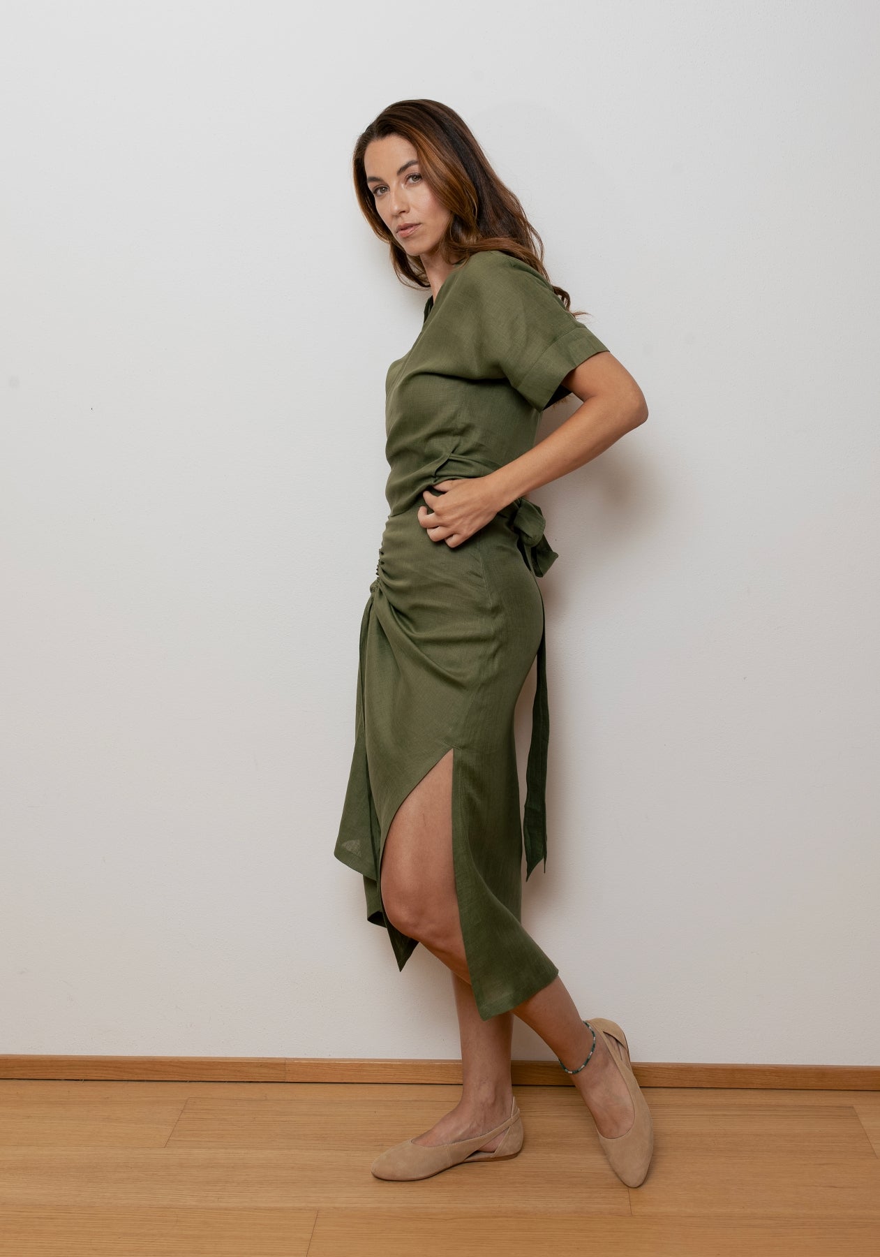 Ľanová sukňa s bočným rozparkom a nastaviteľným viazaním v páse je ideálnou voľbou pre pohodlný a zároveň elegantný vzhľad. Vďaka zmäkčenej úprave látky je veľmi príjemná na tele a vhodná na každodenné nosenie počas teplých dní. Sukňa má pohodlný strih, čiastočne elastický pás a skrytý bočný zips.