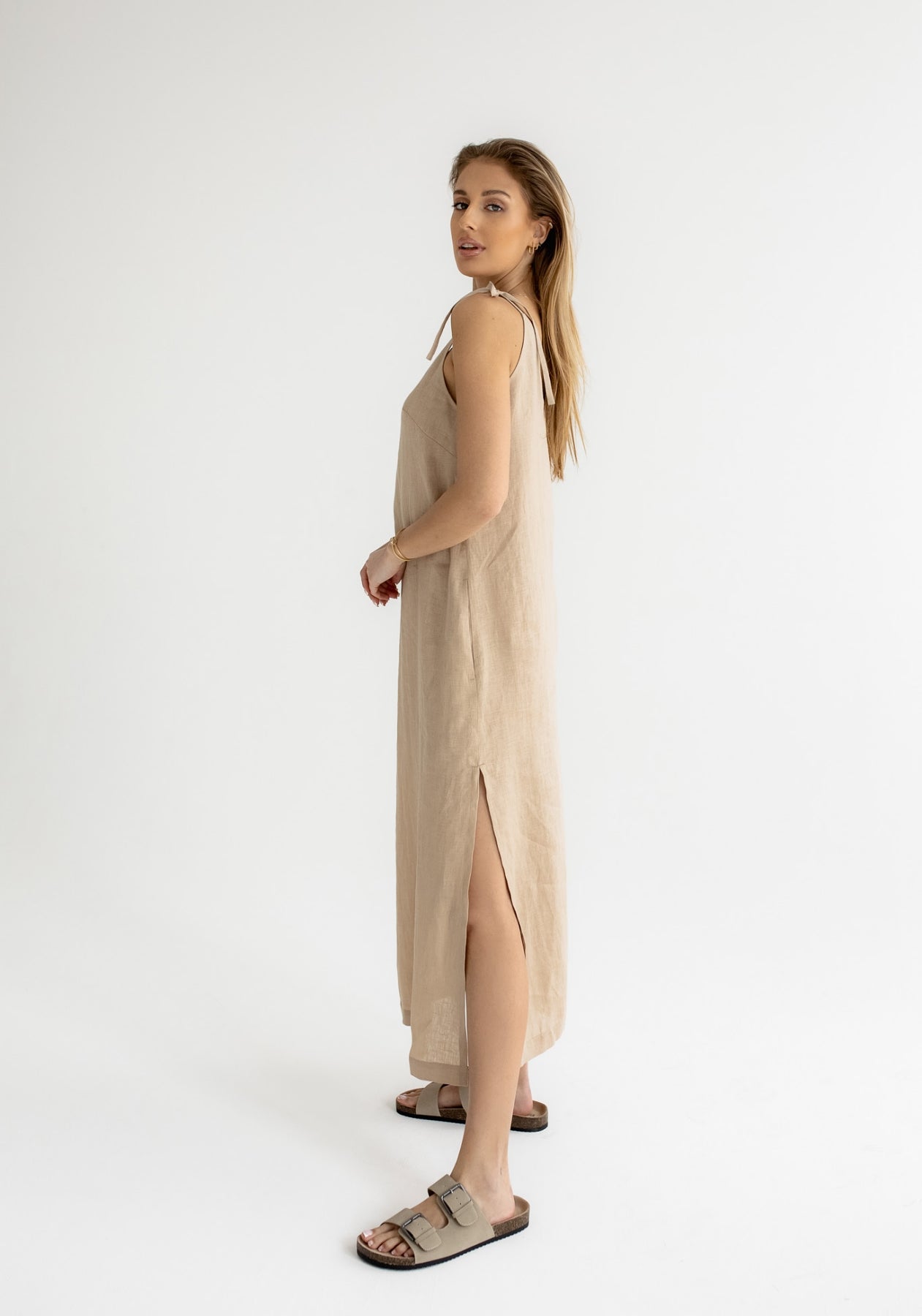 Dámske lnené šaty s nastaviteľnými rámikmi a bočným rozparkom. Neuveriteľne príjemné na tele vďaka zmäkčujúcej úprave látok. Veľkosť je skôr väčšia-loose fit. Vyrobené precízne a udržateľne v ČR a SR. Látka po vypratí ešte podstatne zjemní.