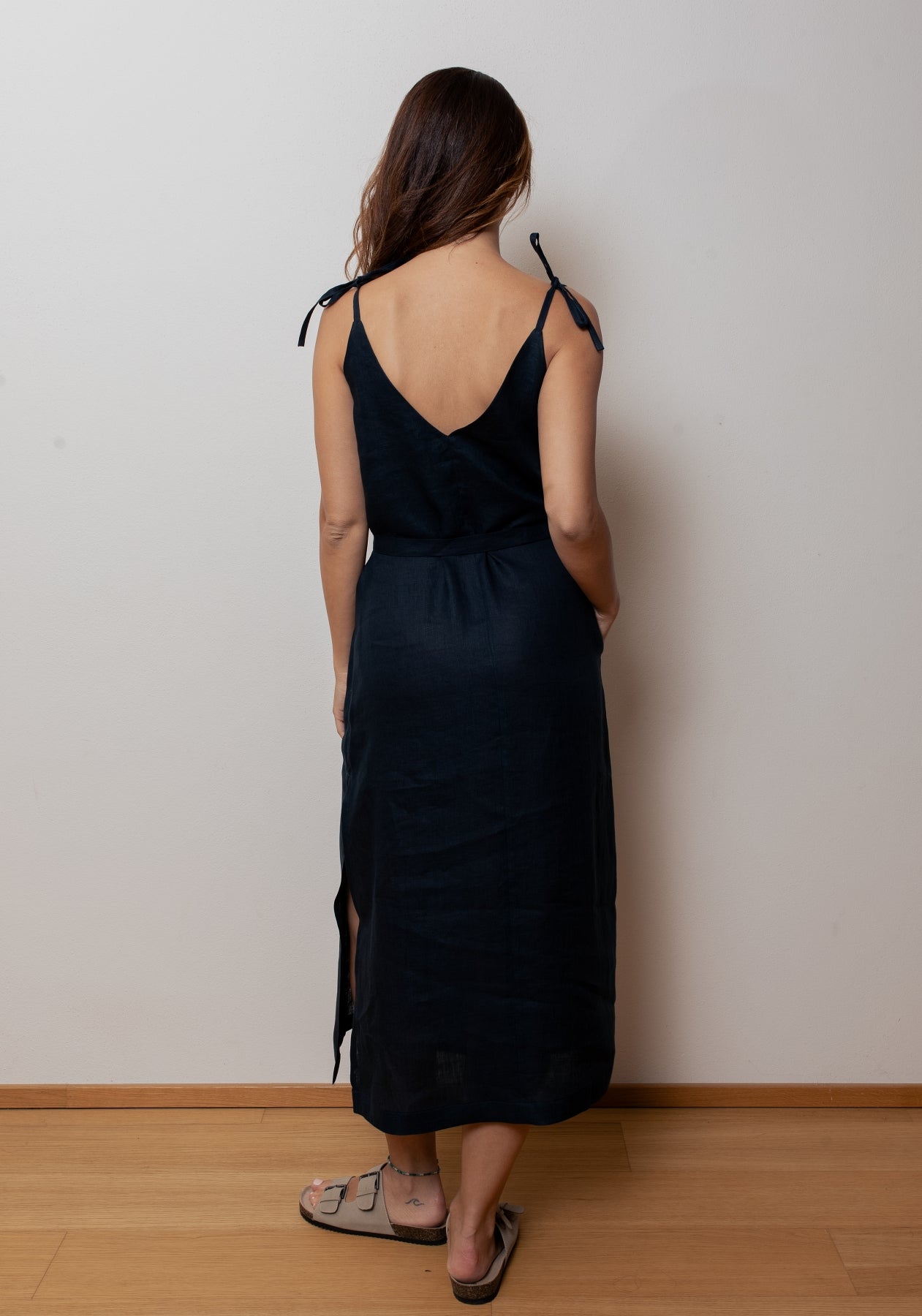 Dámske ľanové šaty s nastaviteľnými ramienkami, vreckami a bočným rozparkom dopĺňa viazací opasok, vďaka ktorému si šaty prispôsobíš svojej postave. Voľnejší strih (loose fit) poskytuje maximálne pohodlie a možnosť rôznych spôsobov uväzovania – vpredu, vzadu alebo na boku.