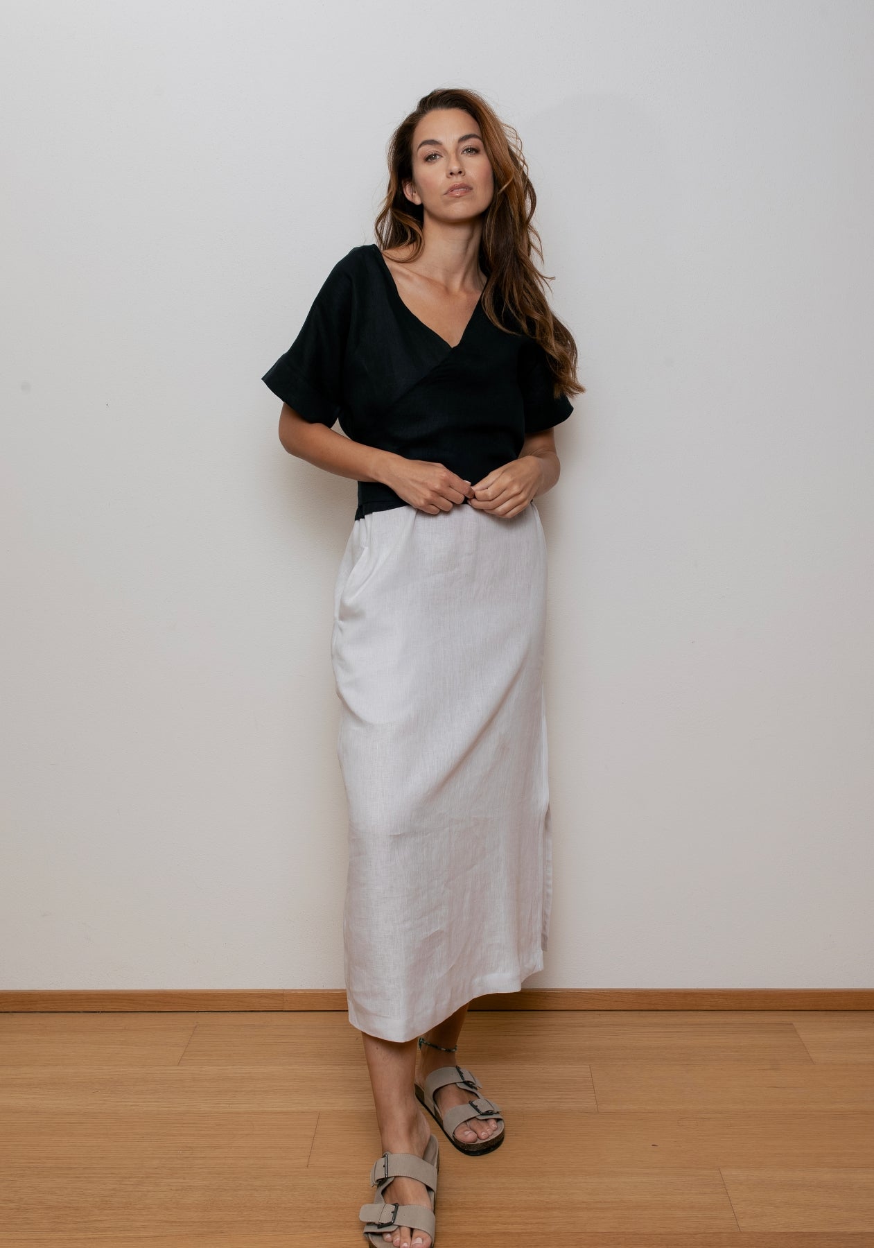 Tento ľanový zavinovací top je vyrobený zo 100 % prírodného ľanu so zmäkčujúcou úpravou, vďaka čomu je mimoriadne príjemný na dotyk a pohodlný na nosenie. Variabilné zaväzovanie umožňuje prispôsobenie veľkosti – pohodlne sedí na dve konfekčné veľkosti. Nosiť ho môžete samostatne k nohaviciam, šortkám alebo sukni – ak si zvolíte sukňu v rovnakom odtieni, pôsobí ako šaty. Rovnako dobre sa nosí ako štýlový doplnok na tričko, top alebo šaty.