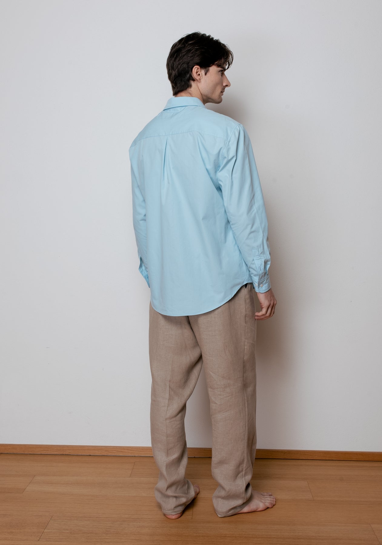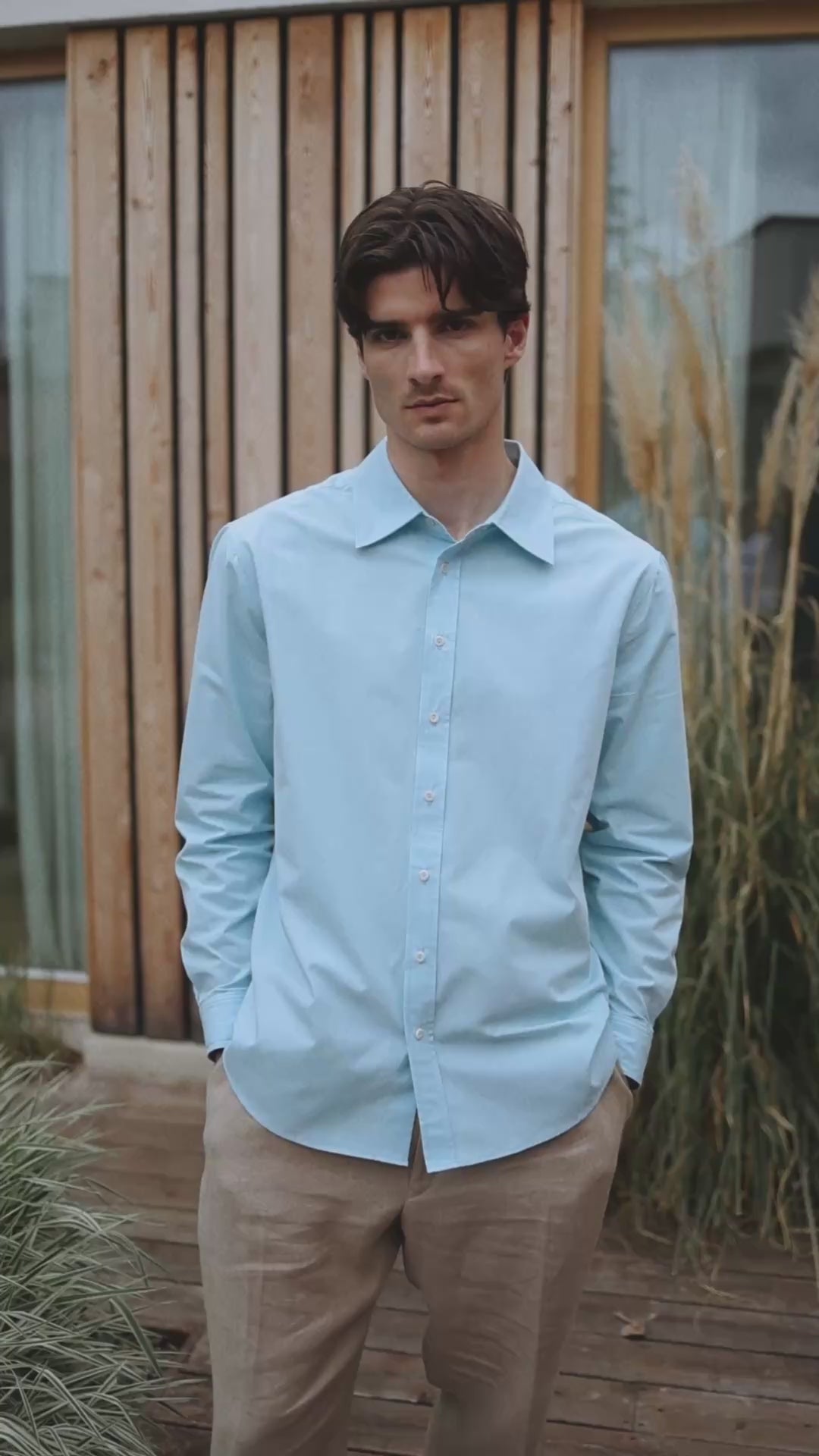 Pánska košeľa s klasickým golierom je ušitá z certifikovanej biobavlny s jemnou úpravou, ktorá je výnimočne príjemná na pokožke. Voľnejší strih (loose fit) ponúka komfort a zároveň pôsobí elegantne. Skvelá voľba na každodenné nosenie aj formálne príležitosti.